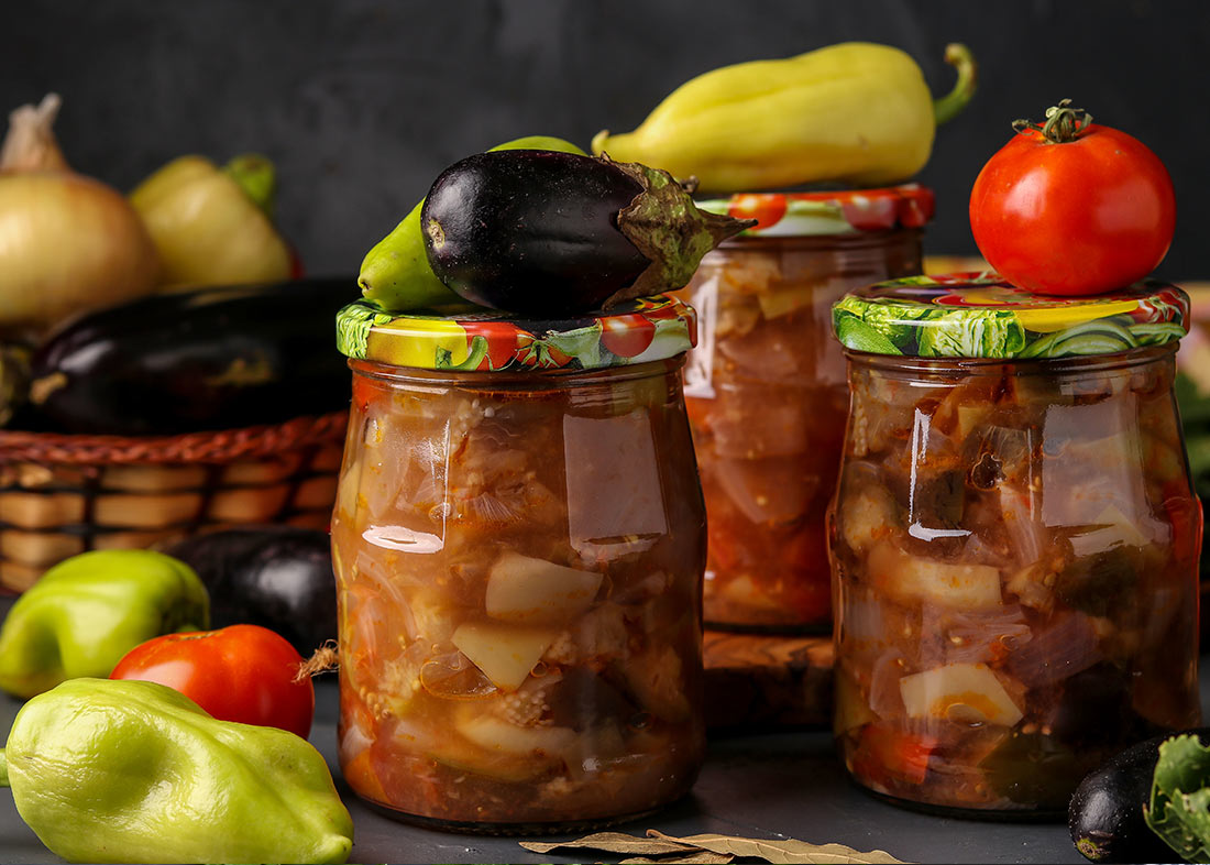 Colocar en recipientes esterilizados una capa de la preparación de berenjenas, y luego una capa de aceite. Repetir el proceso hasta completar los envases. Al finalizar, presionar con una cuchara o mortero para quitar el aire y tapar los envases.