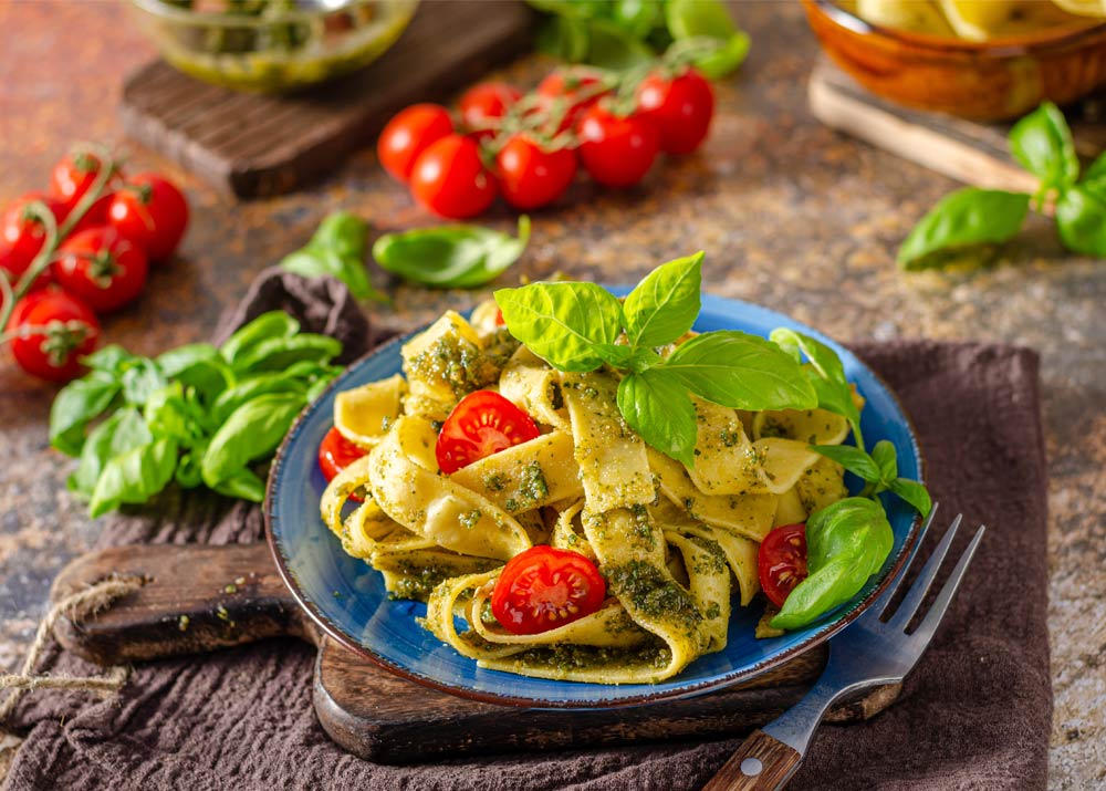 Pasta con pesto de albahaca y tomates cherry